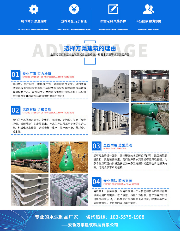 安徽萬(wàn)渠建筑科技有限公司是集研發(fā),生產(chǎn)制造,市場(chǎng)推廣為一體的綜合性企業(yè)。公司主要經(jīng)營(yíng)環(huán)保型預(yù)制鋼筋混凝土裝配式組合型檢查井和蓄水裝置等城建配套產(chǎn)品。產(chǎn)品生產(chǎn)過(guò)程采用獨(dú)特的生產(chǎn)工藝,機(jī)械化流水作業(yè)。產(chǎn)品大規(guī)模生產(chǎn),生產(chǎn)效率高,耗能少,成本低,產(chǎn)品使用壽命長(zhǎng)、免維護(hù)、無(wú)滲漏、無(wú)污染,符合“綠色環(huán)保,低碳節(jié)能”的發(fā)展要求,是傳統(tǒng)磚砌井池的理想替代產(chǎn)品。